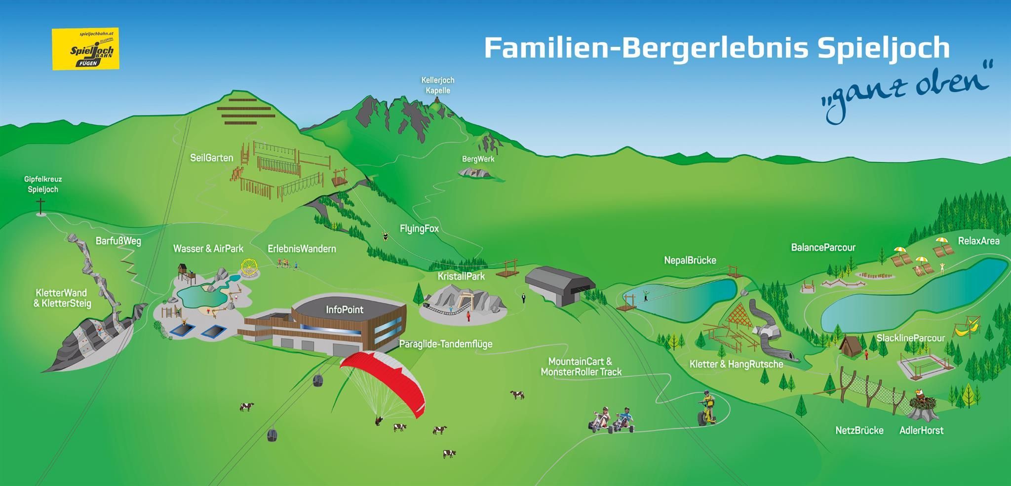 Pozwól ultranowoczesnej i bezbarierowej 10-osobowej kolejce gondolowej zabrać Ciebie i Twoją rodzinę z Fügen na Spieljoch o wysokości 1 858 metrów. Na górze czeka na Ciebie świeże górskie powietrze i pierwszorzędna panorama. Od stacji górskiej aż do szczytu o wysokości 1 920 metrów na najmłodszych czeka prawdziwy świat przygód na łonie natury: duży wodny park zabaw, ścieżka bosych stóp na szczycie, Flyingfox, monster skutery lub wózki górskie, park linowy i wiele więcej! Szczegółowe informacje można znaleźć na stronie www.spieljochbahn.at