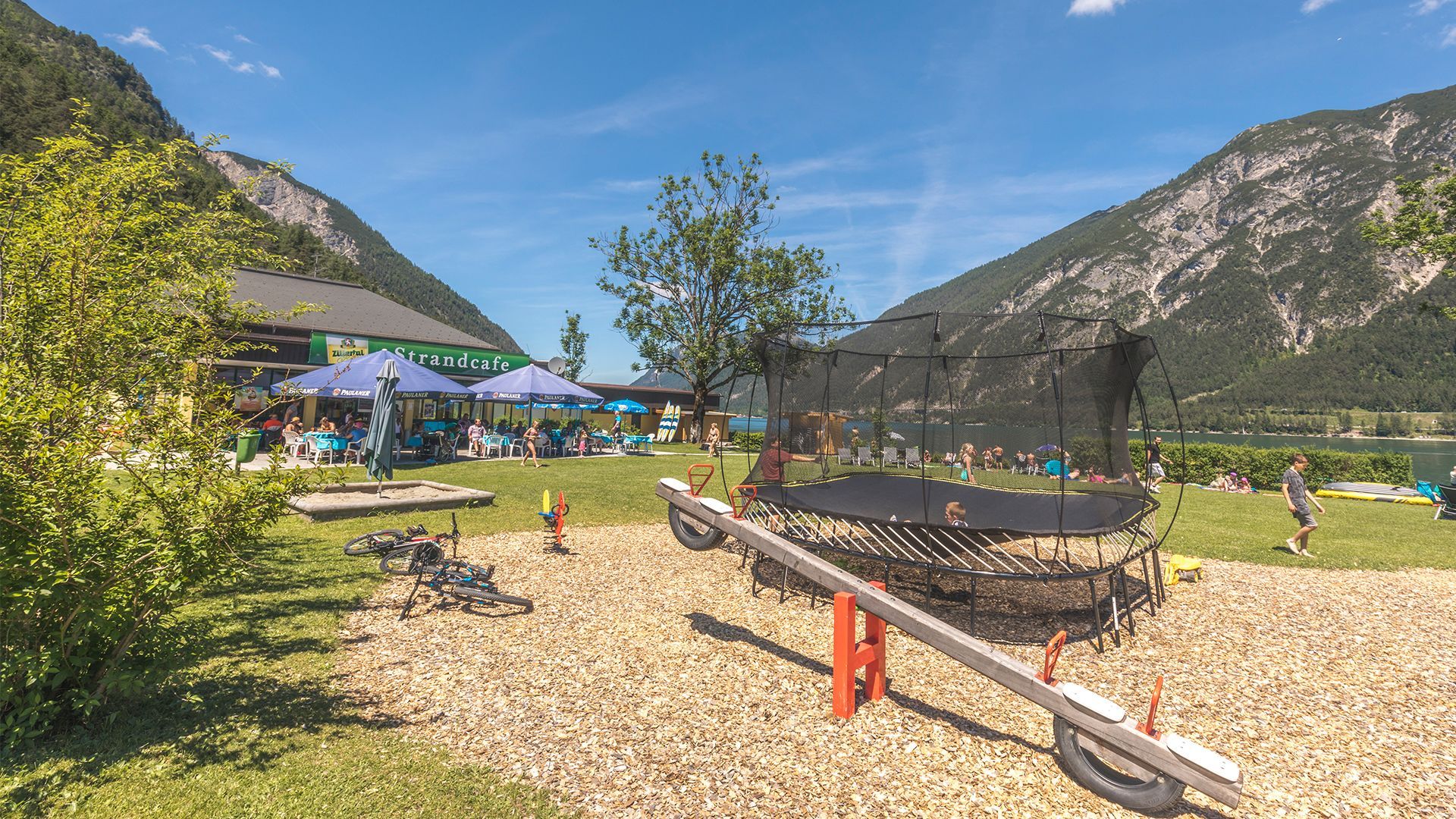 Zaledwie kilka metrów od centrum miasta, lido Pertisau oferuje duży trawnik do opalania, plac zabaw, platformę do nurkowania, bar z przekąskami i wypożyczalnię SUP - idealne na aktywny dzień pływania!