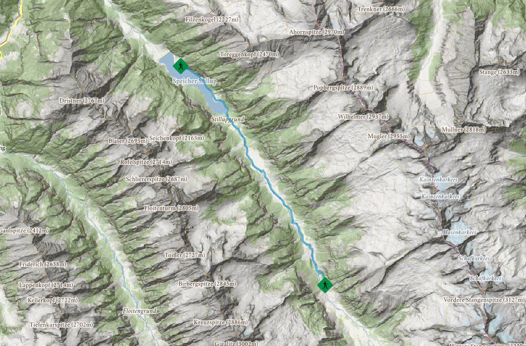 Szlak wodospadowy przecina kilka romantycznych potoków od Gasthaus Wasserfall, 1 108 m do Grüne Wand Hütte, 1 438 m, mija malownicze górskie pastwiska i oferuje nową perspektywę na piękno doliny Stilluptal.